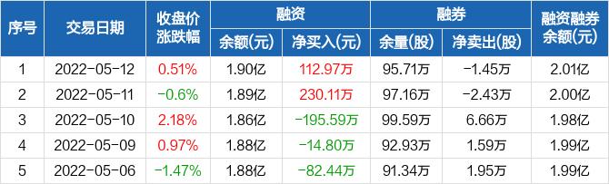 信息顯示,2022年5月12日融資凈買入112.97萬元;融資余額1.9億元,較前一日增加0.6%。